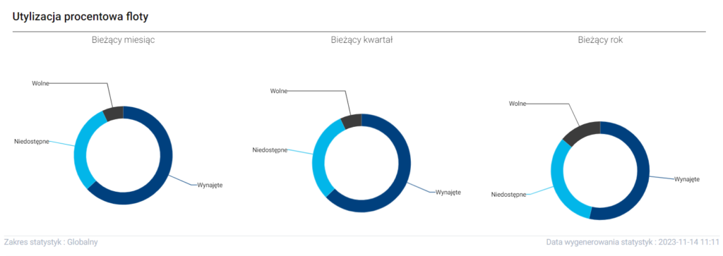 Piąta sekcja przedstawia utylizację procentową floty. Znajduje się na niej wykresy za bieżący miesiąc, kwartał oraz rok i ukazuje stosunek pomiędzy autami wolnymi, niedostępnymi oraz wynajętymi.