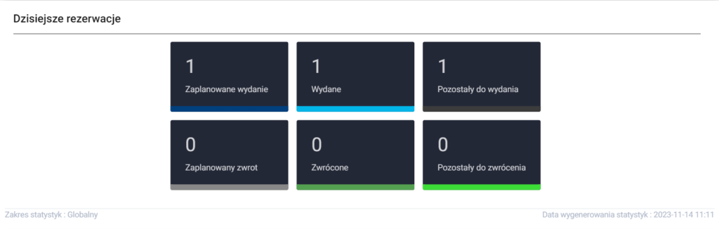 Szósta sekcja przedstawia rezerwacje oraz zwroty z dnia dzisiejszego. Każda z nich została podzielona po trzy stany na każdą:
