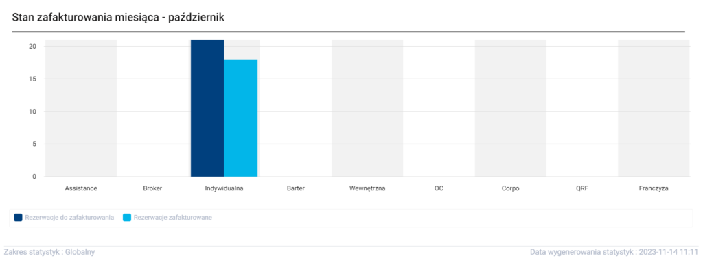 Ósma sekcja przedstawia stan zafakturowania w miesiącu. Na wykresie znajduje się osiem typów najmów każdy z nich przedstawia ilość rezerwacji oraz ukończonych zafakturowań