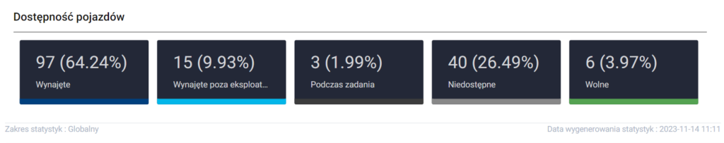 Każda z nich ukazuje ilość samochodów w grupie oraz ich stosunek procentowy do ogólnej ilości transportów. Dodatkowo po kliknięciu na na nich przeniesie nas do Pojazdy / Flota gdzie będzie można zobaczyć szczegółowy opis pojazdów w danej grupie.