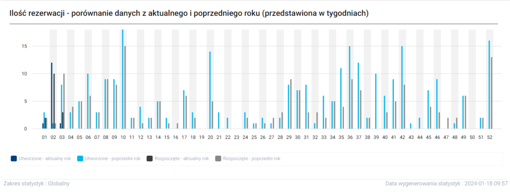 Sekcja Ilość rezerwacji przedstawia statystykę rezerwacji w ciągu roku rozpisaną w tygodniach. Poniżej znajduje się legenda, w której są cztery elementy, a mianowicie: