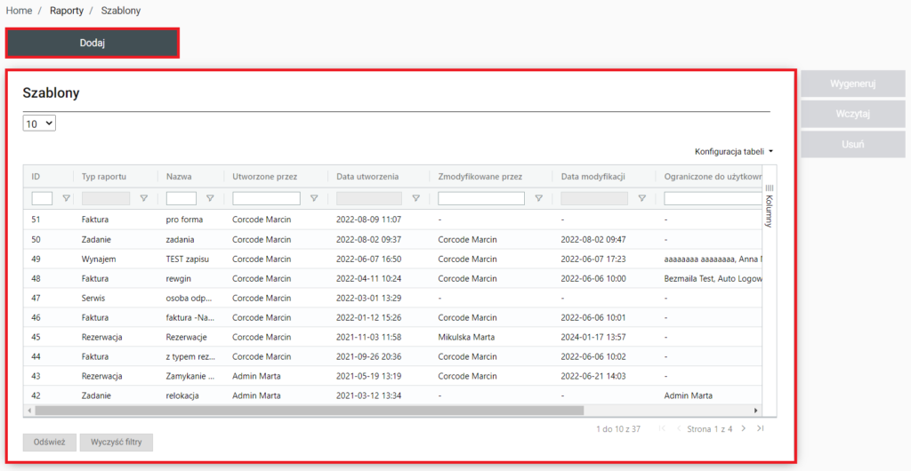Po wejściu do sekcji Kreator zostaje wyświetlona lista szablonów, nad nią znajduje się przycisk Dodaj po kliknięciu na niego zostaniemy przeniesieni do Home / Raporty / Szablony / Dodawanie gdzie można będzie utworzyć nowy szablon raportów.