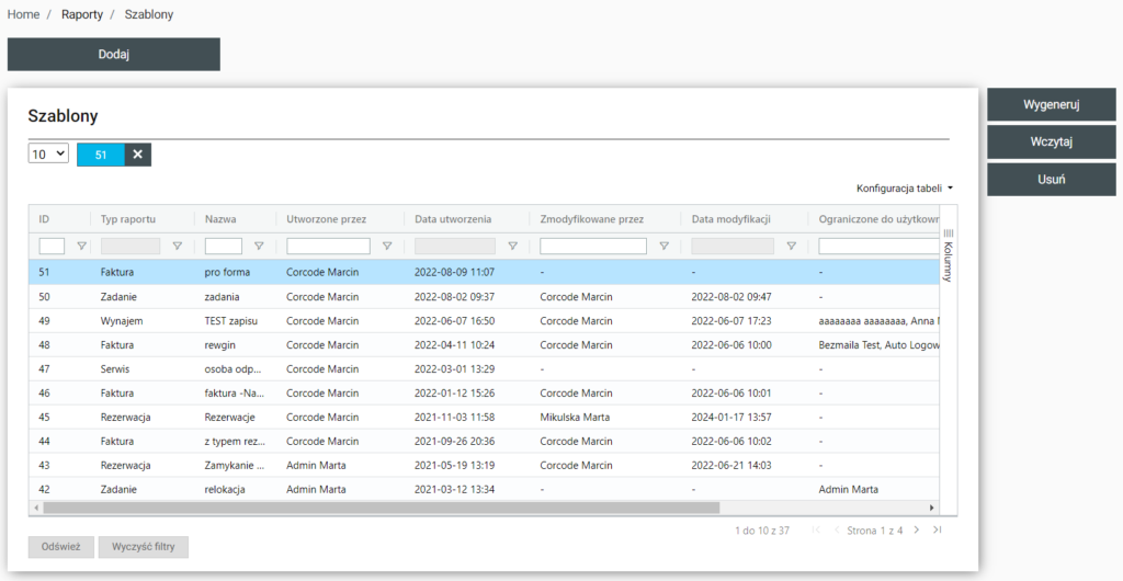 Po wybraniu zostaniemy przeniesieni do Home / Raporty / Szablony / Kreator gdzie można będzie wygenerować, Edytować, oraz zapisać zmieniony raport jako nowy zachowywać wybrany wcześniej
