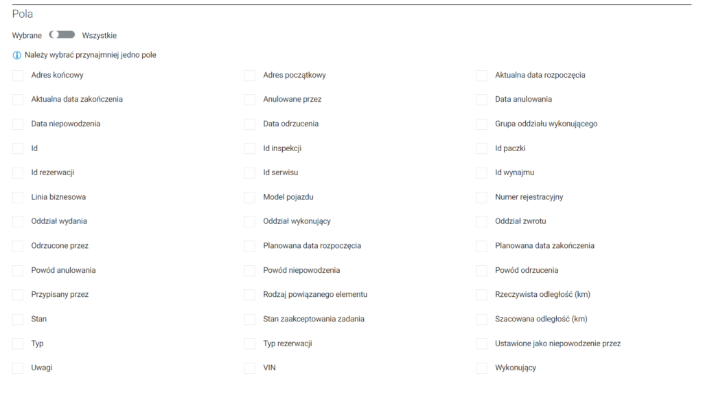 W tej sekcji należy wybrać informacje jakie będą wyświetlane w raportach używających ten szablon.