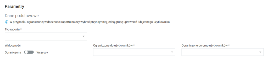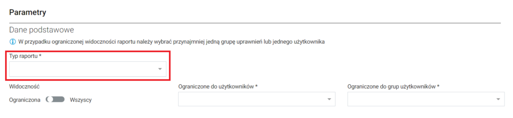 Na początku należy wybrać typ raportu aby dalsza kreacja szablonu była możliwa. Po wybraniu zostają wyświetlone się kolejne sekcje.