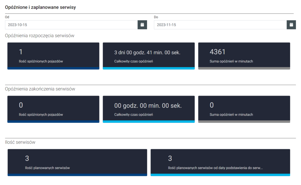 Mówią one o Ilości i czasie zapóźnień. Na końcu znajduje się informacja dotycząca ilości zaplanowanych serwisów.