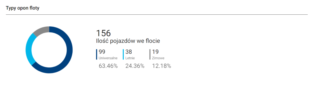 Pierwsza sekcja przedstawia ilość pojazdów we flocie oraz typy opon samochodów, które zostały podzielone na trzy kategorie: