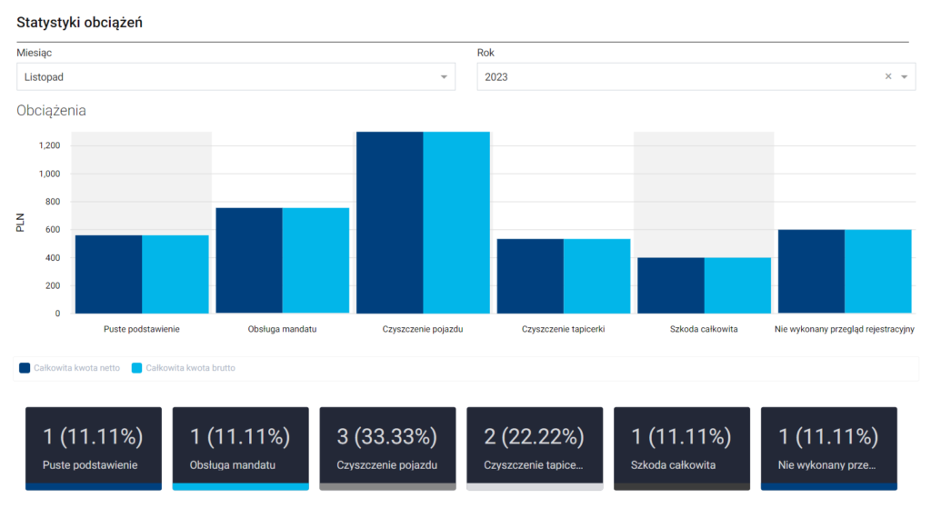 Pod każdą z nich jest ich stosunek procentowy do wszystkich pojazdów potrzebujących przeglądu we flocie.