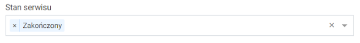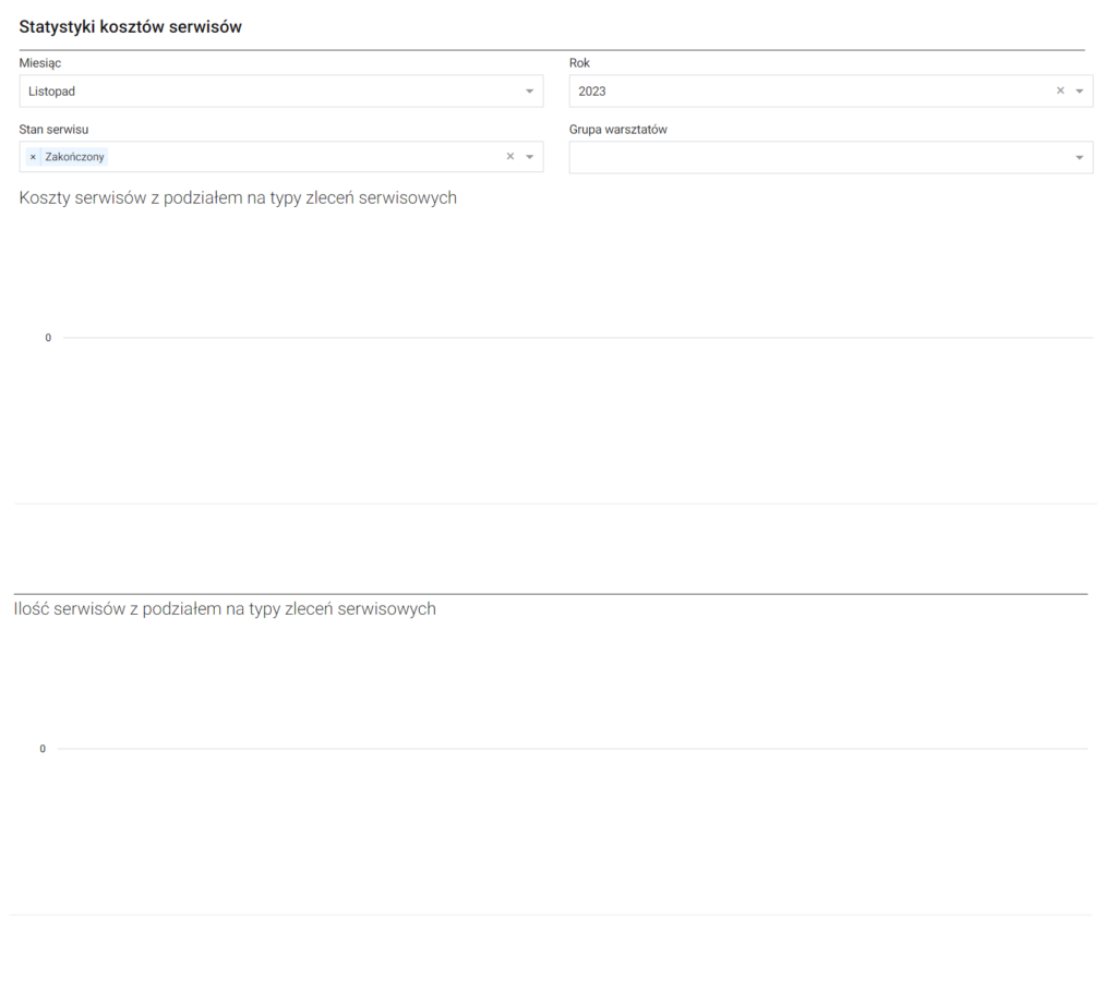 Trzecia sekcja przedstawia ilość oraz koszty serwisów z podziałem na typy zleceń serwisowych. Jest możliwość wybrania okresu oraz sprecyzowania wyświetlanych danych wybierając odpowiednie dane w polach: