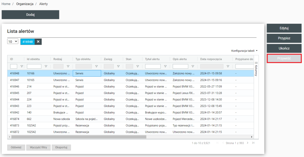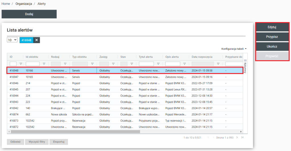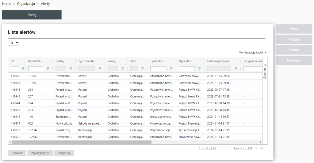 Po wejściu do sekcji Alerty zostaje wyświetlona lista alertów.
