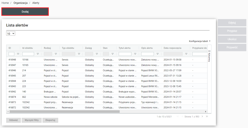 Nad listą znajduje się opcja dodania nowego alertu po jej wybraniu zostaniemy przeniesieni do Home / Organizacja / Alerty / Dodawanie.