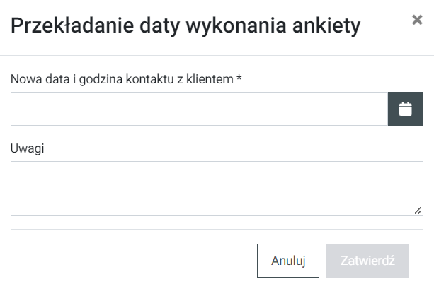 Po kliknięciu na przycisk Przełóż pojawia się możliwość przełożenia daty wykonania ankiety przez klienta oraz zapisania uwag.