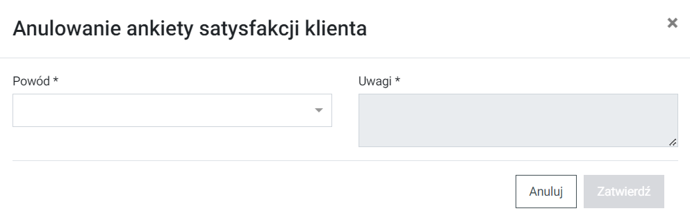 Po naciśnięciu na przycisk Anuluj pojawia się możliwość anulowania ankiety klienta poprzez podania powodu oraz można zapisać uwagi.