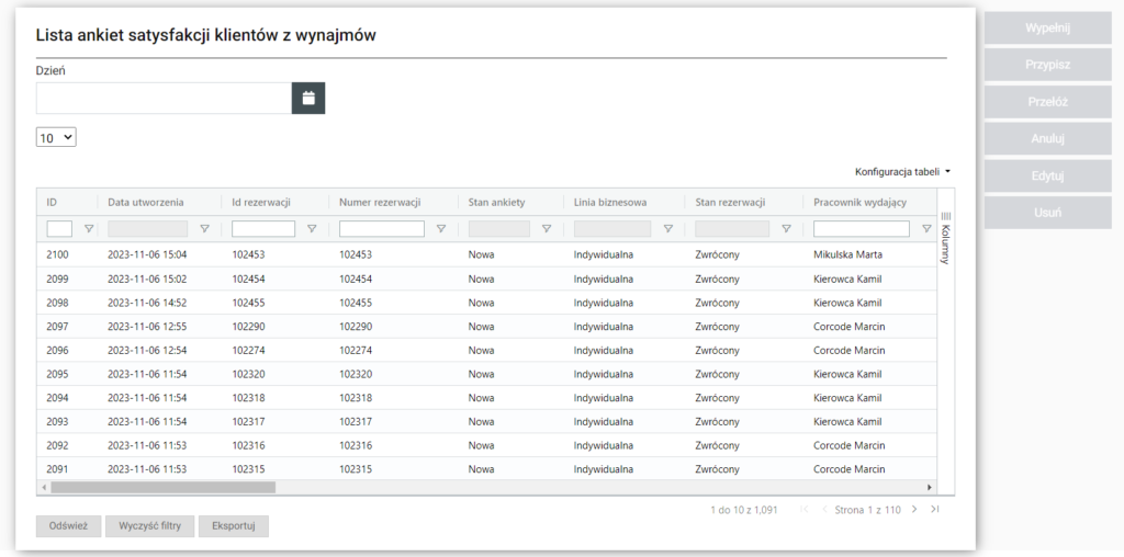 Sekcja Ankiety przedstawia ankiety wypełnione przez klientów w wybranym dniu. Jest możliwość filtrowania wyników, a na dole są funkcja odświeżenia, wyczyszczenia filtrów oraz eksportowania danych. Z prawej strony są odpowiednie funkcje: