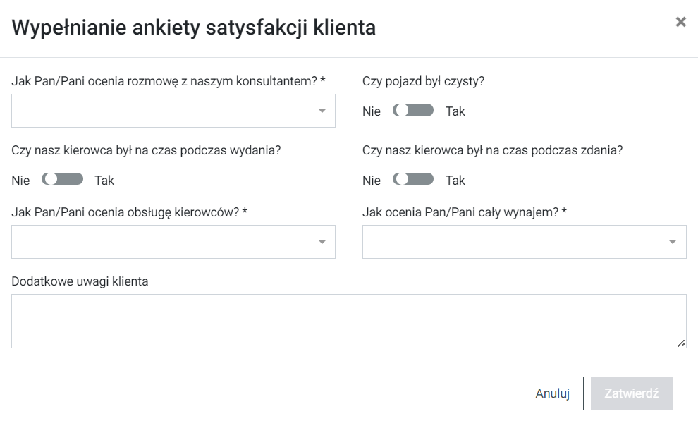 Po kliknięciu na przycisk Wypełnij wyskakuje nam ankieta dotyczącą satysfakcji klienta. Są tam kategorie:
