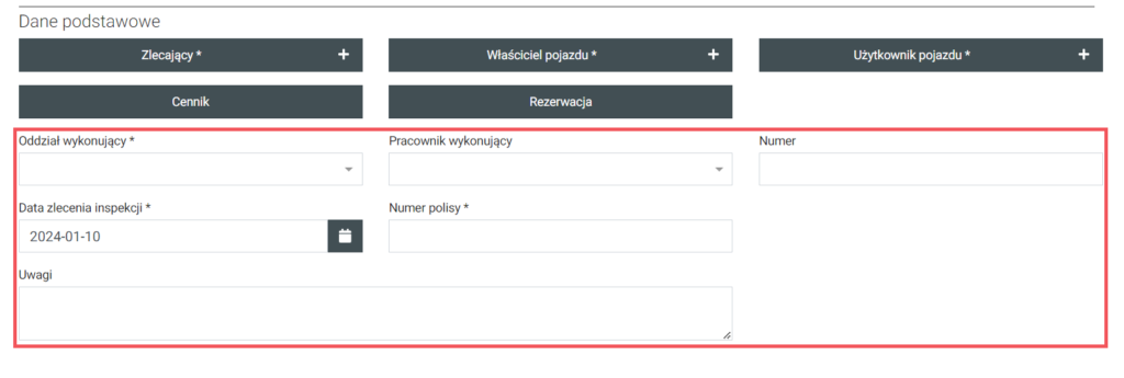 Po wyborze opcji Dodaj zostaniemi przeniesieni do Home / Organizacja / Inspekcje / Dodawanie i pojawi się możliwość dodania nowej inspekcji. W funkcji dodawania inspekcji znajduje się dwie sekcje: