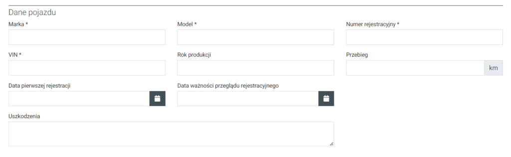 W sekcji Dane pojazdu znajdują się następujące obowiązkowe dane do uzupełnienia