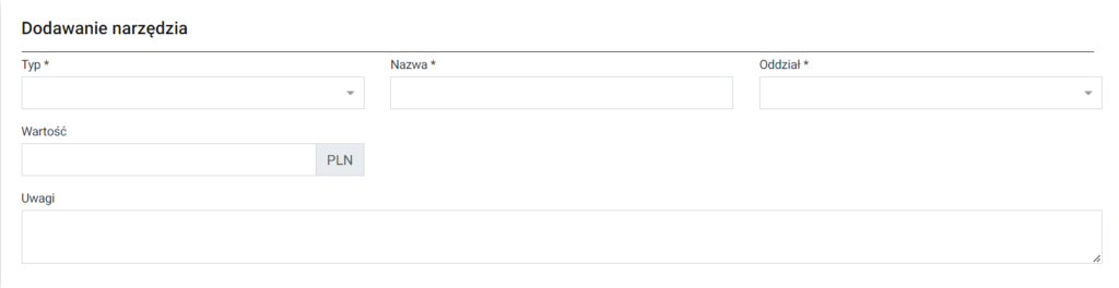 Po wybraniu opcji dodania narzędzia zostajemy przeniesieni do Home / Organizacja / Narzędzia / Dodawanie gdzie znajdują się następujące informacje do uzupełnienia:
