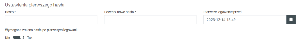 sekcja Ustawienie pierwszego hasła przedstawia następujące dane do uzupełnienia: