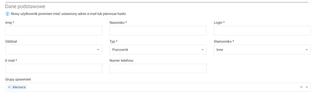 Po kliknięciu na przycisk dodaj zostajemy przeniesieni do Home / Organizacja / Użytkownicy / Dodawanie gdzie zostają wyświetlone nam cztery sekcji: