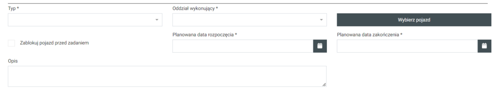 Na początku trzeba będzie wybrać typ zadania, oddział wykonujący i planowaną datę rozpoczęcia oraz zakończenia. Istnieje też możliwość zablokowania pojazdu przed zadaniem (nie było możliwości utworzenia rezerwacji z tym pojazdem do wykonania zadania) oraz napisania opisu dotyczącego danego zadania.