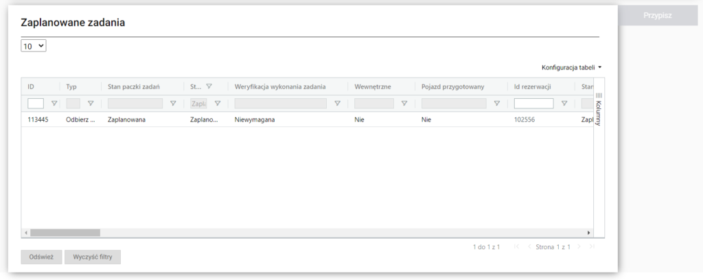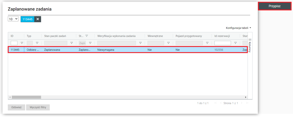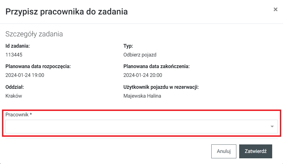 Po wybraniu opcji przypisz pojawia się możliwość przypisania pracownika do wybranego zadania. W polu zaznaczonym na czerwony należy wybrać pracownika który zostanie przypisany do zadania. Na końcu należy kliknąć Zapisz wtedy czynność zostanie wykonana.