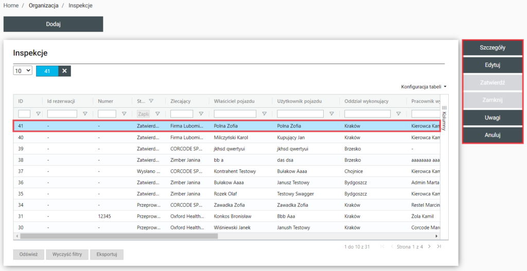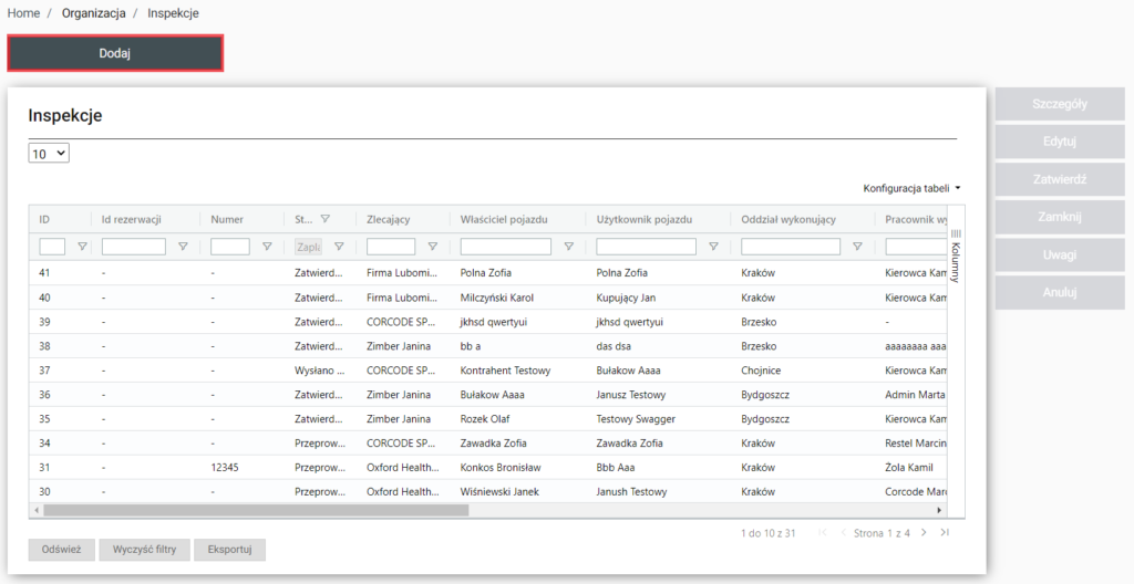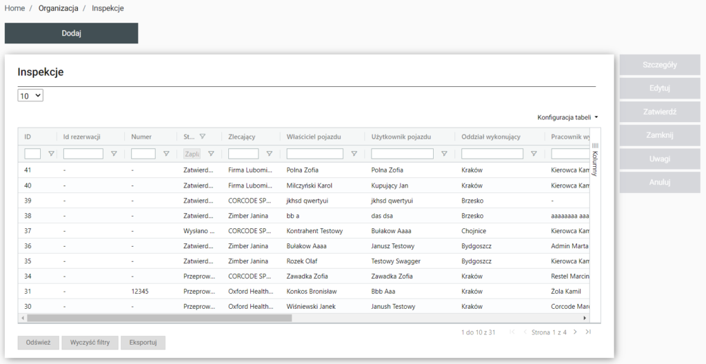 | Szczegóły | Po wyborze zostaniemy przeniesieni do Home / Organizacja / Inspekcje / Szczegóły (id. Wybranej inspekcji) |