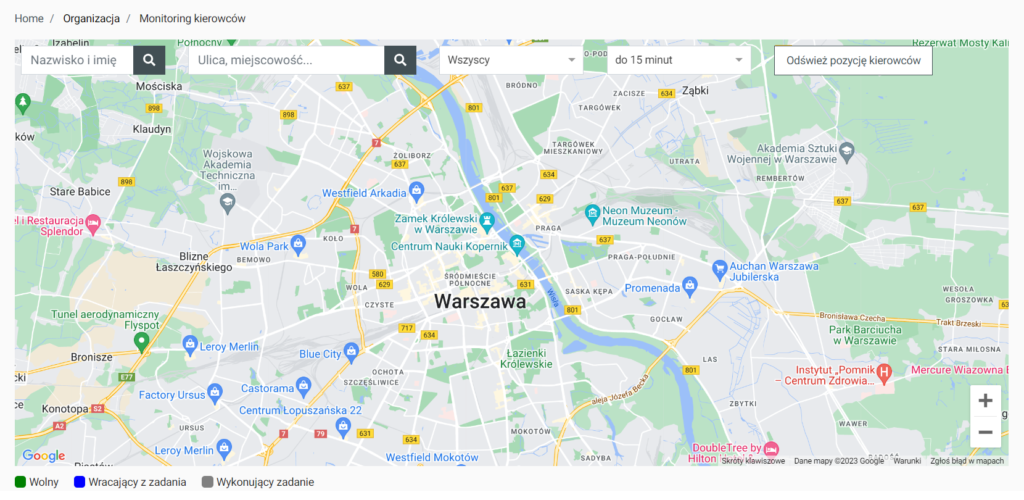 Sekcja monitoring kierowców przedstawia mapę z lokalizacją wszystkich kierowców, na samym dole znajduje się legenda podzielona na trzy kategorie: