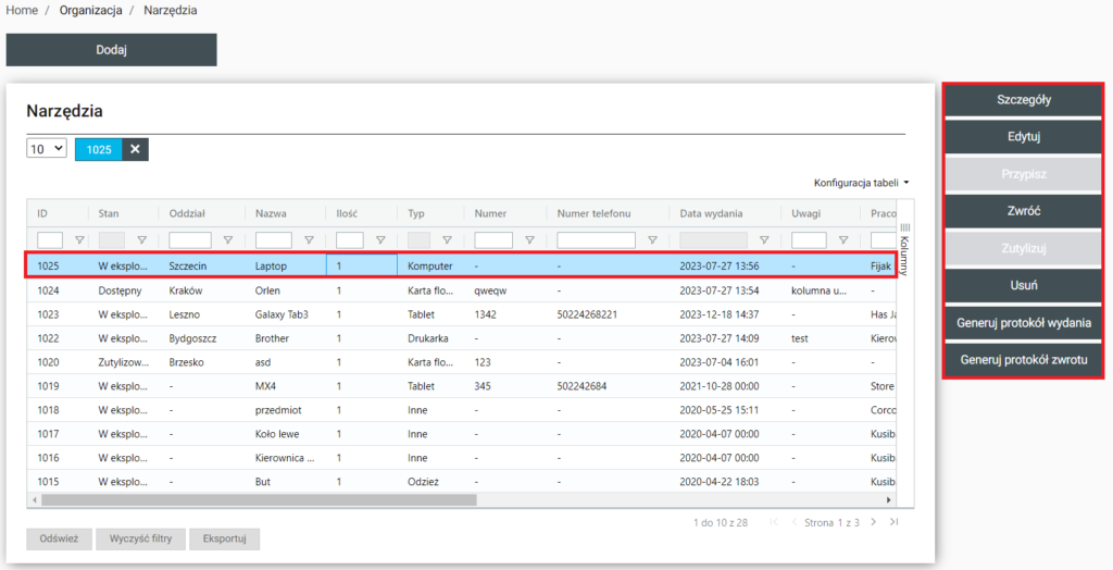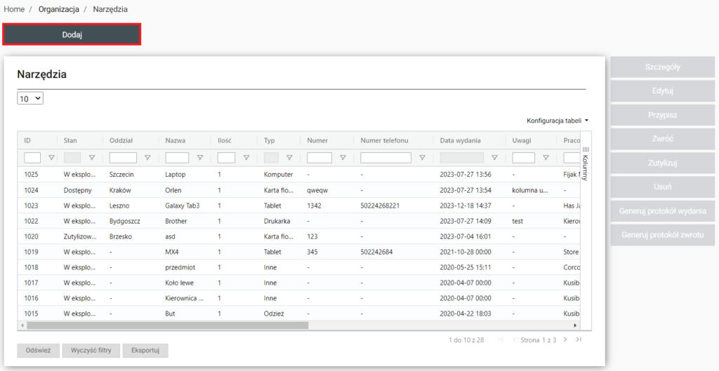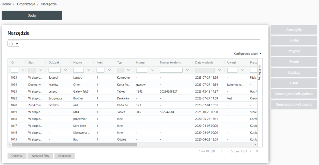 | Szczegóły | Po wybraniu zostaniemy przeniesieni do Home / Organizacja / Narzędzia / Szczegóły (id.(wybranego narzędzia) i pojawia się możliwość zobaczenia szczegółów wybranego narzędzia |