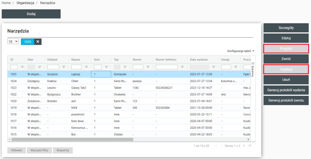 | Zutylizuj | Po wybraniu pojawia się opcja zutylizowania narzędzia z możliwością wpisania powodu oraz wybrania daty. |