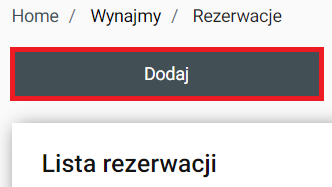Nad listą znajduje się przycisk Dodaj po kliknięciu na niego zostajemy przeniesieni do Home / Wynajmy / Rezerwacje / Dodawanie gdzie można będzie utworzyć nową rezerwację.