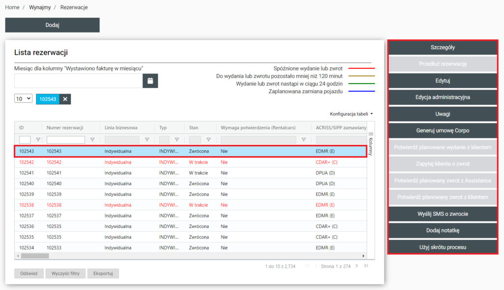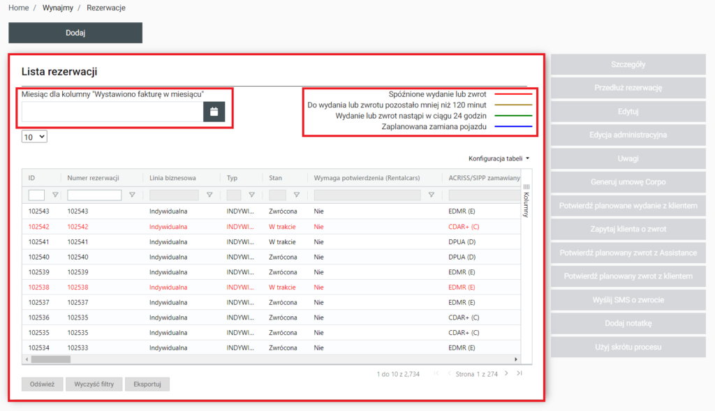 Po przejściu do do sekcji zostanie wyświetlona lista rezerwacji z możliwością filtrowania wyświetlanych wyników.