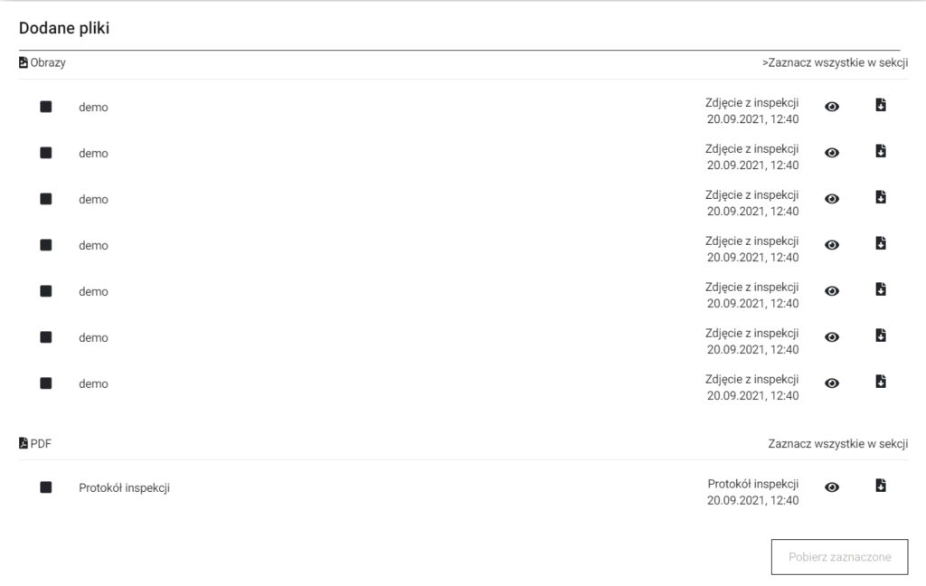 Nad każdą sekcją plików znajduje się możliwość zaznaczenia całej grupy.