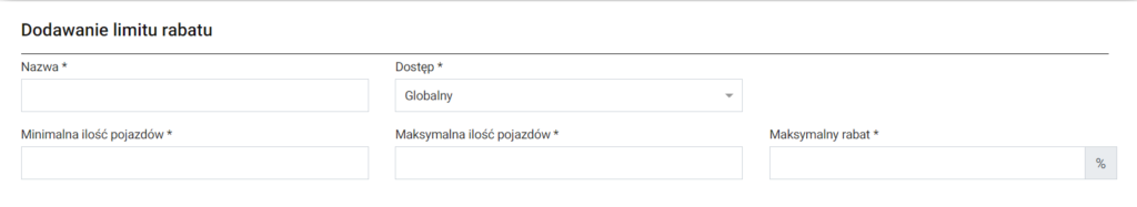 Po wybraniu opcji Dodaj zostajemy przeniesieni do Home / Oferty / Limity rabatów / Dodawanie gdzie znajduje się możliwość utworzenia limitu rabatu. W wyświetlonych polach. Należy wpisać nazwę minimalną ilość pojazdów maksymalną ilość pojazdów maksymalny rabat. Także należy wybrać dostęp do limitu rabatu.