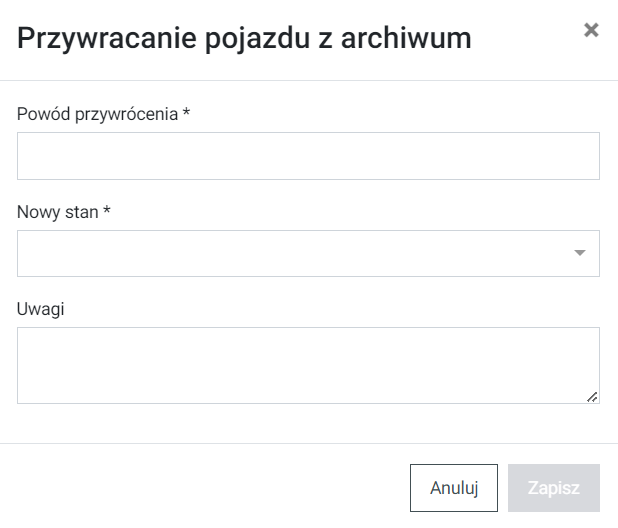 Po wybraniu opcji przywróć pojawia się możliwość przywrócenia pojazdu z archiwum. W polach należy wpisać Powód przywrócenia o należy wybrać nowy stan, także można zapisać uwagi.