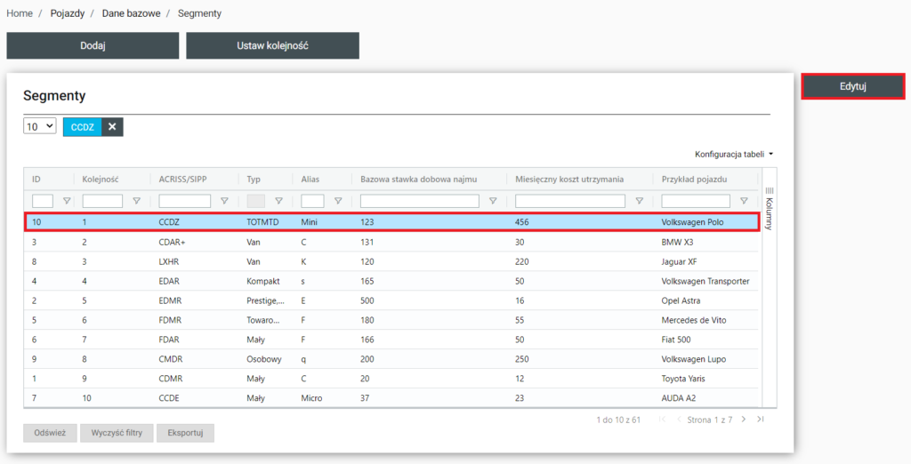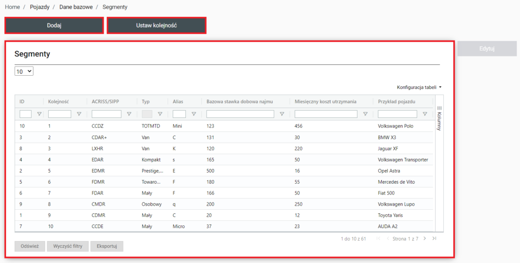 | Ustaw kolejność | Po kliknięciu na tą funkcje zostaniemy przeniesieni do Home / Pojazdy / Dane bazowe / Segmenty / Kolejność. Znajduje się tam też instrukcja. |