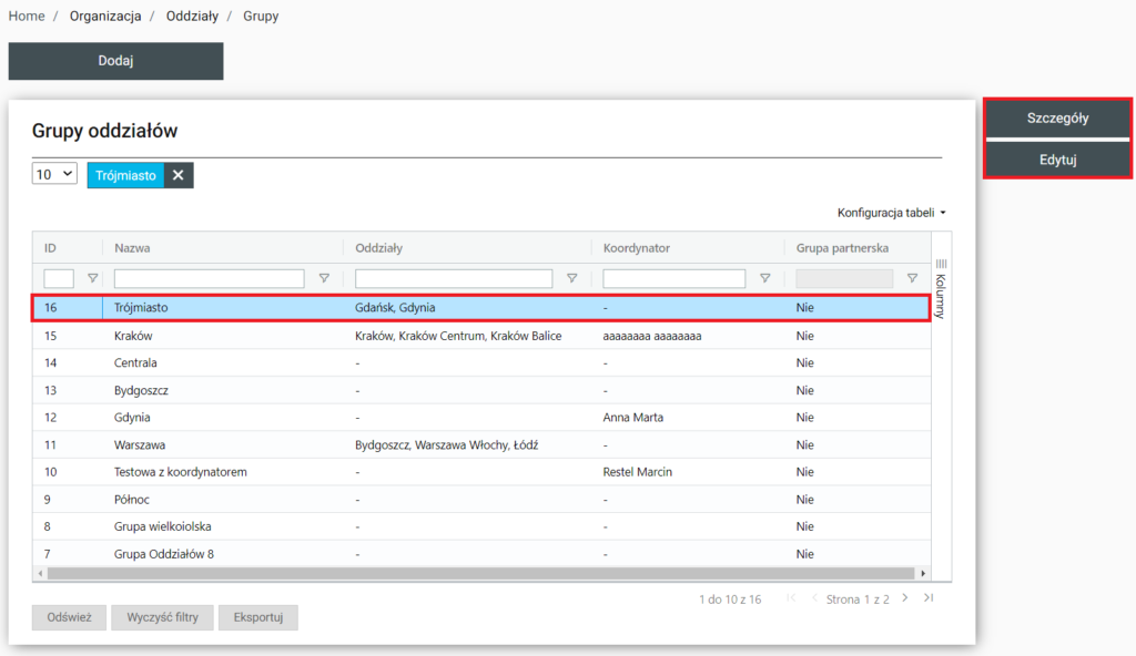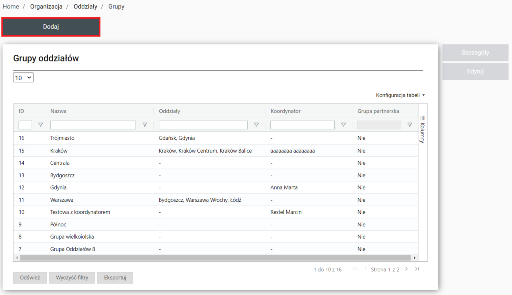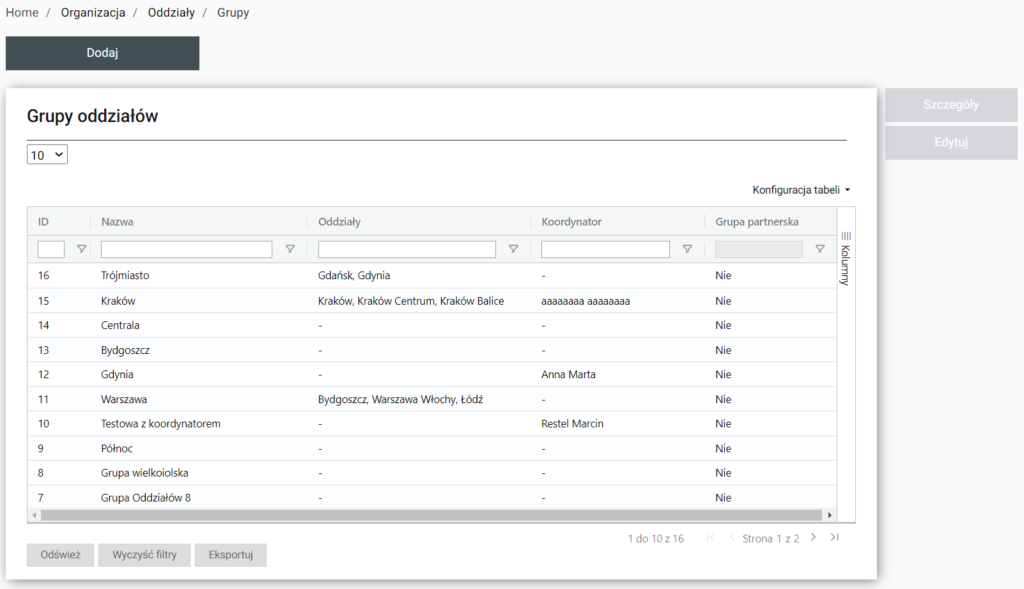 Po wejściu do podsekcji Grupy zostaje nam wyświetlona lista z grupami oddziałów znajdującymi się w bazie danych.