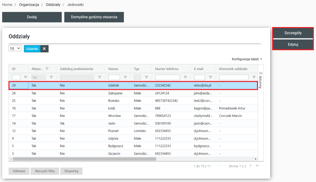 | Dodaj | Po wybraniu zostaniemy przeniesieni do Home / Organizacja / Oddziały / Jednostki / Dodawanie gdzie pojawi się możliwość Dodania nowej jednostki oddziału. |