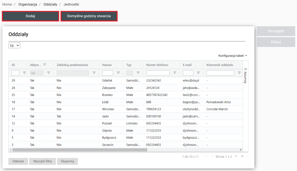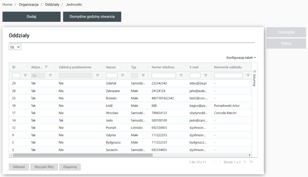 | Domyślne godziny otwarcia | Po wybraniu zostajemy przeniesieni do Home / Organizacja / Oddziały / Jednostki / Domyślne godziny otwarcia. |