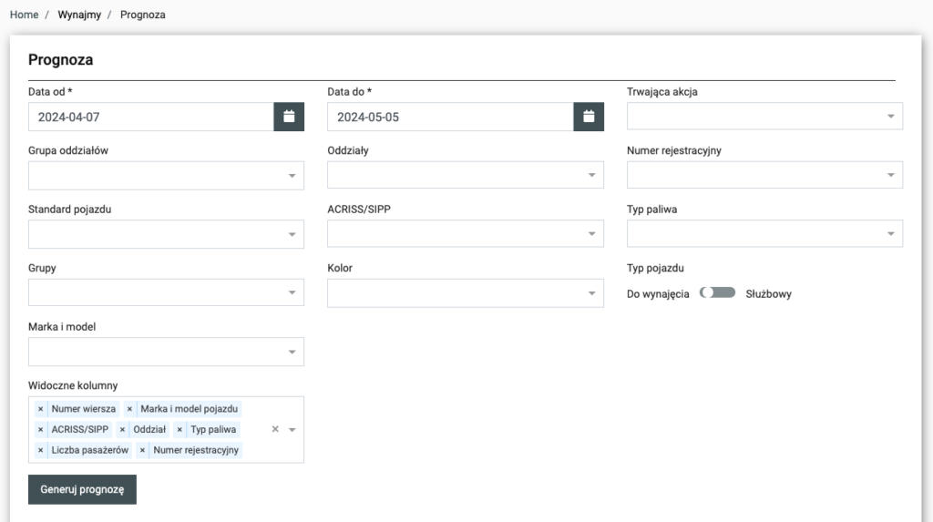 Po wejściu do sekcji zostaną wyświetlone pola w których trzeba będzie wybrać dane na podstawie, których zostanie wygenerowany raport. Na samym dole znajduje się przycisk klikając, na który raport zostanie wygenerowany.