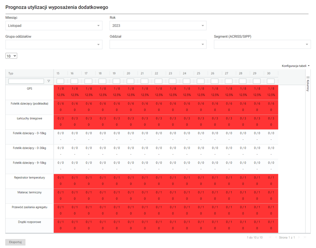 Podsekcja Prognoza wyposażenia przedstawia tabelę na której znajduje się procentowa prognoza wykorzystania dodatkowego zarezerwowanego sprzętu. Można wybrać okres przeglądanych danych i sprecyzować tabelę wybierając odpowiednie dane w polach: