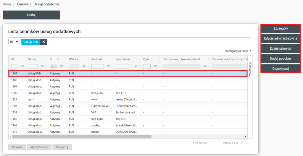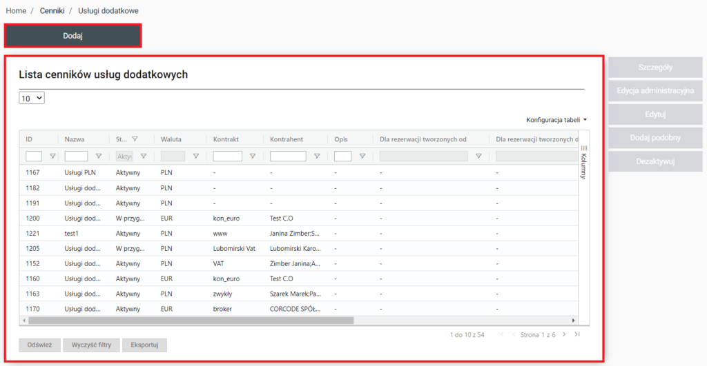 Po wejściu do sekcji zostanie wyświetlona lista cenników usług dodatkowych. Nad nią znajduje się przycisk Dodaj, po kliknięciu na niego zostaniemy przeniesieni do Home / Cenniki / Usługi dodatkowe / Dodawanie gdzie można będzie utworzyć nowy cennik usługi dodatkowy.