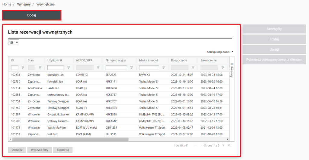 Sekcja Wewnętrzne przedstawia listę rezerwacji wykonanych przez pracowników. Nad listą znajduje się opcja Dodaj po jej wybraniu zostaniemy przeniesieni do Home / Wynajmy / Wewnętrzne / Dodawanie gdzie można będzie utworzyć nową rezerwację wewnętrzną