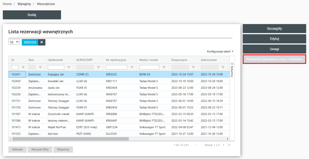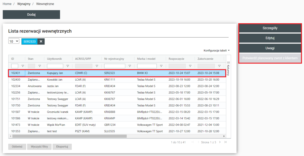 | Szczegóły | Po wybraniu tej funkcji zostajemy przeniesieni do Home / Wynajmy / Wewnętrzne / Szczegóły gdzie można będzie zobaczyć informacji dotyczące wybranej wcześniej rezerwacji. |
