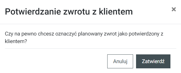 Po kliknięciu na przycisk Potwierdź planowany zwrot z klientem pojawia się możliwość oznaczenia planowanego zwrotu jako potwierdzony.