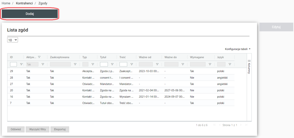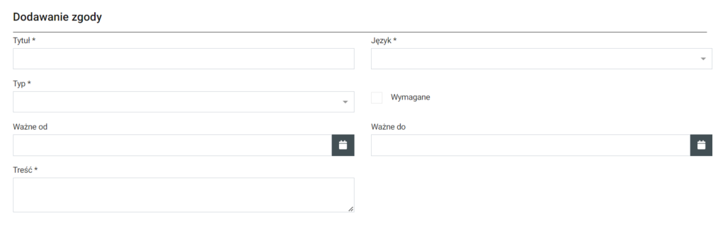 Sekcja Dodawanie zgody zawiera następujące dane do uzupełnienia poprzez wpisanie: