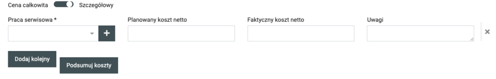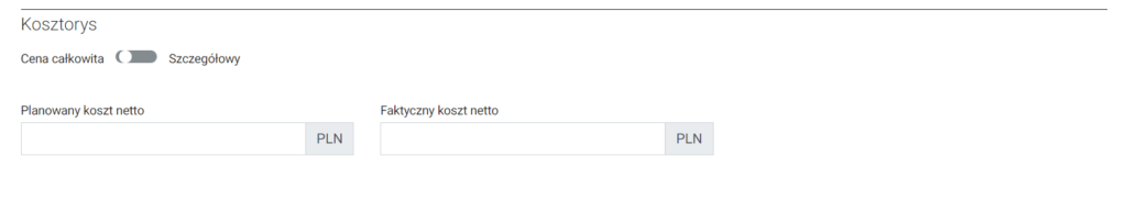 W drugiej sekcji znajduje się wybór pomiędzy wpisaniem kosztu całkowitego lub szczegółowego. Standardowo możemy wpisać cenę całkowitą jeżeli natomiast chcemy inaczej musimy przełączyć krążek
