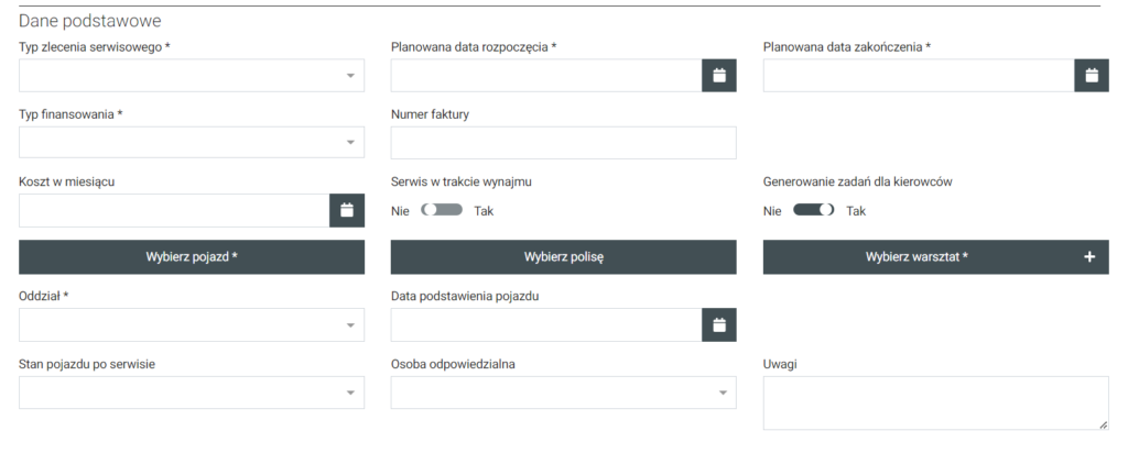 W pierwszej sekcji znajduja sie dane podstawowe, które należy uzupełnić w lukach. Także należy będzie wybrać pojazd, firmę i warsztat z listy. Istnieje też możliwość utworzenia nowego warsztatu zeby to zrobic nalezy kliknac na plusik obok przycisku.