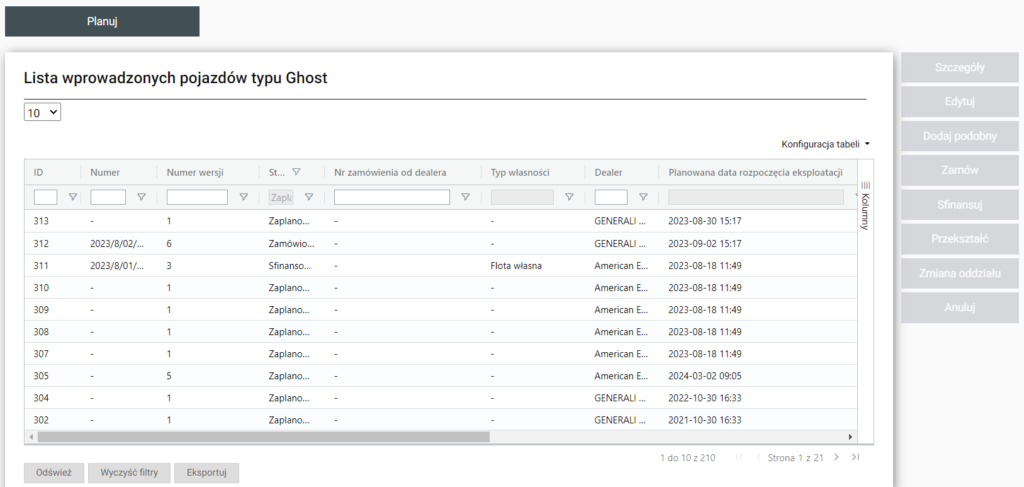 W sekcji Ghosty wyświetla się lista wprowadzonych pojazdów typu Ghost, także obok znajdują się następujące funkcje: