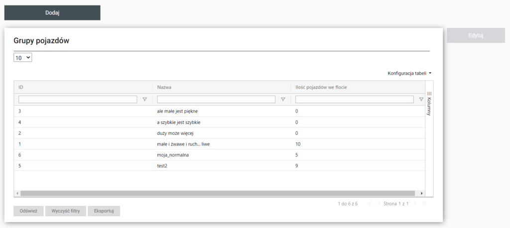 Sekcja Grupy pojazdów Przedstawia listę grup pojazdów, także znajdują się tam takie funkcje jak dodaj oraz edytuj. Jest możliwość filtrowania wyników wyświetlanych w tabelce, a także można odświeżyć i wyczyścić filtry.